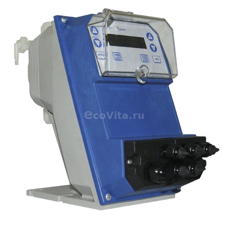 Аналоговый дозирующий насос Seko Maxima Plus MRP 800 с постоянной и пропорциональной производительностью. Постоянная производительность регулируется вручную, а пропорциональная согласно внешнему аналоговому (4÷20 мА) или цифровому сигналу (например, от расходомера).