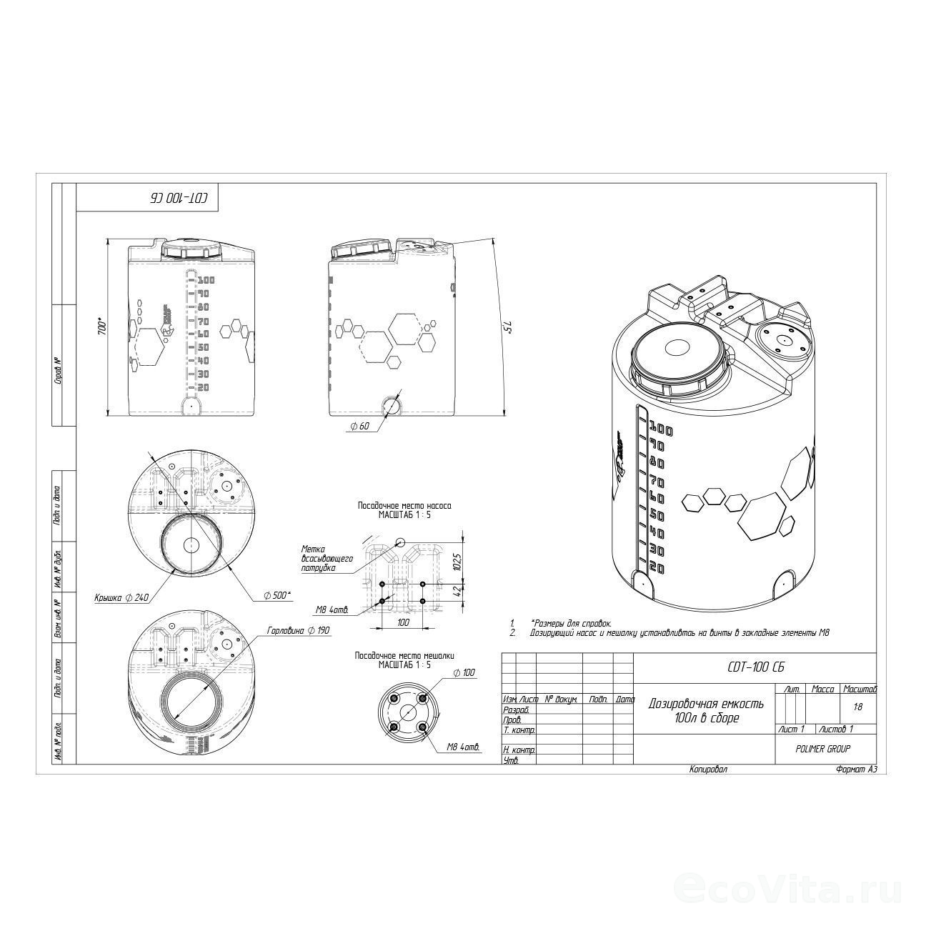 Дозировочная емкость CDT объемом 100 литров с крышкой с клапаном предназначена для подготовки и распределения химических растворов. Конструкция обеспечивает работу с жидкими веществами плотностью до 1,84 г/см³, такими как кислоты, щелочные компоненты, коагулирующие вещества и антисептики.