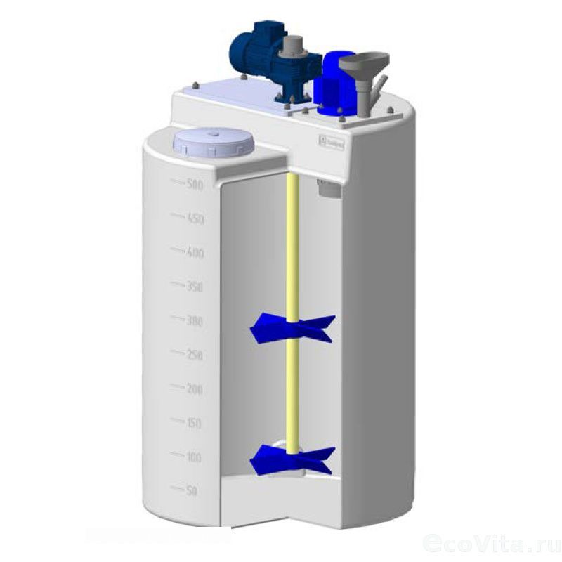 Asterion установка для приготовления флокулянта для емкости 500 литров. Установка предназначена для смешивания химикатов на базе емкости объемом 500 литров с помощью двух мешалок, для растворения порошка и для смачивания гранул.