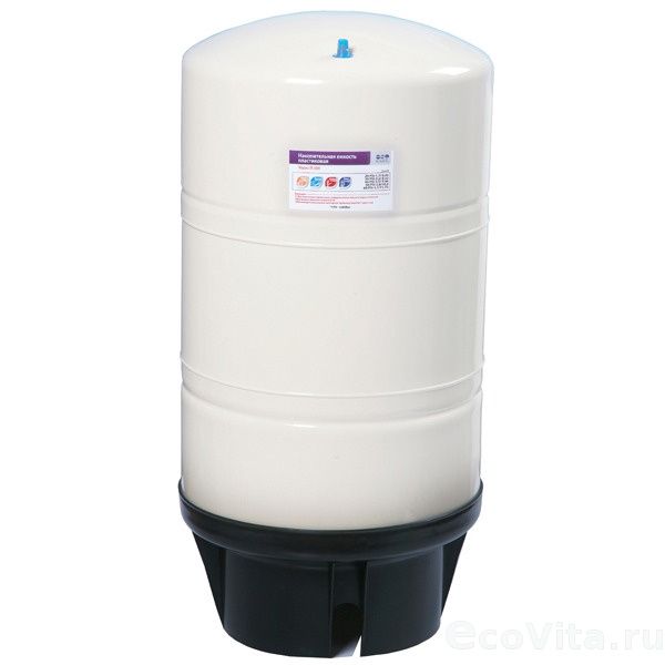 Металлический накопительный бак Raifil объемом 40 галлонов (≈150 л) предназначен для хранения чистой воды, очищенной системой обратного осмоса. Бак надежно защищен от попадания бактерий и обработан консервантом.