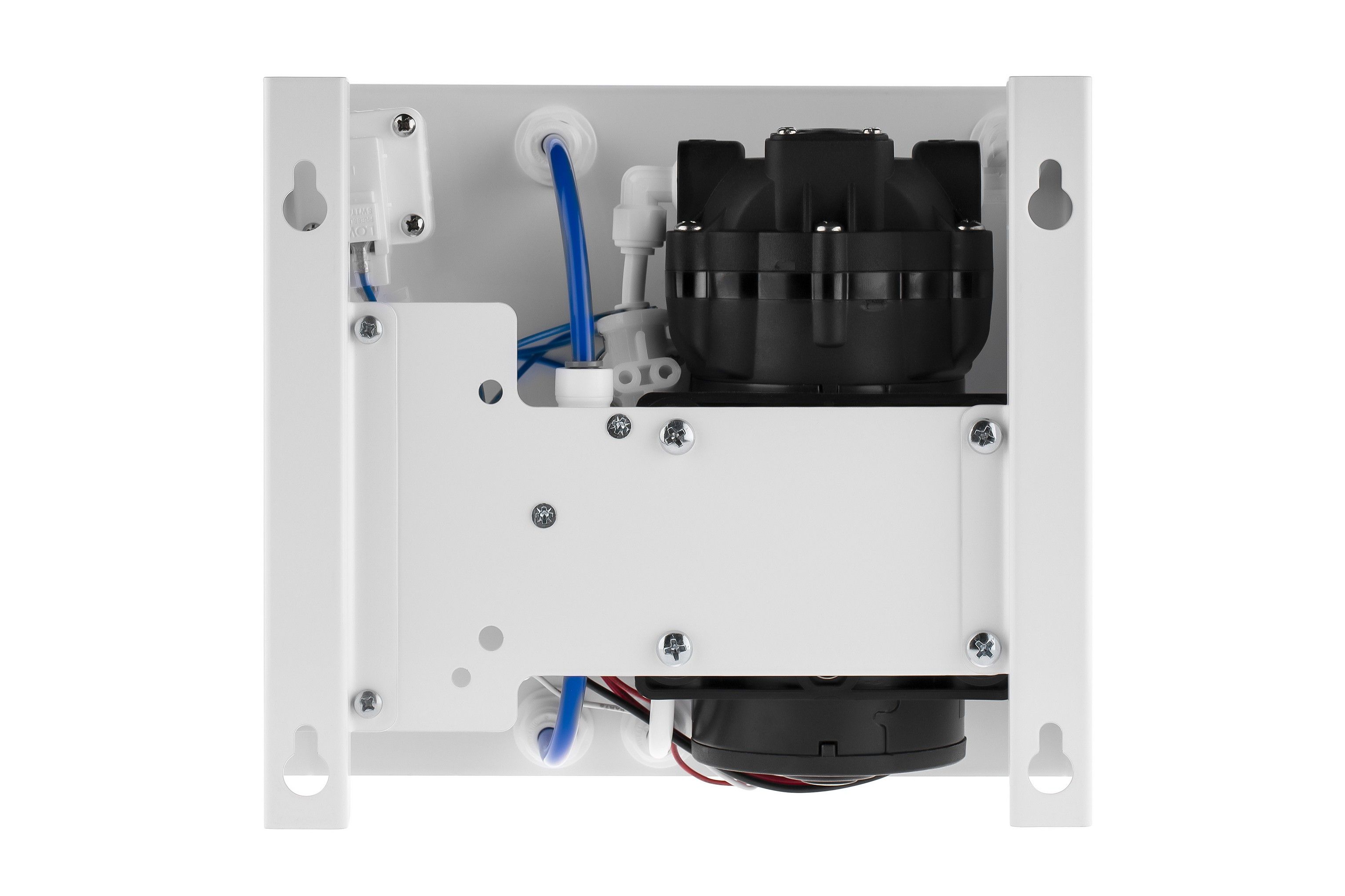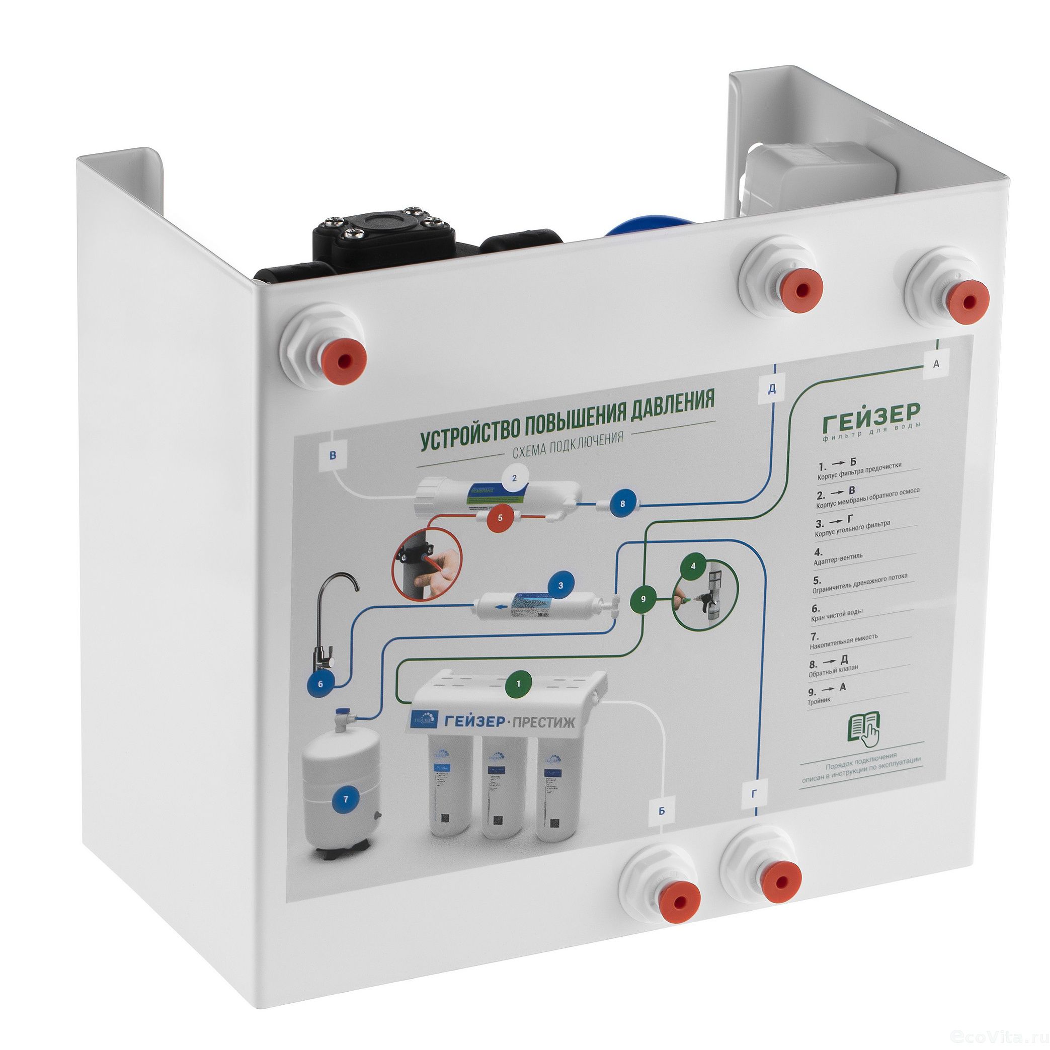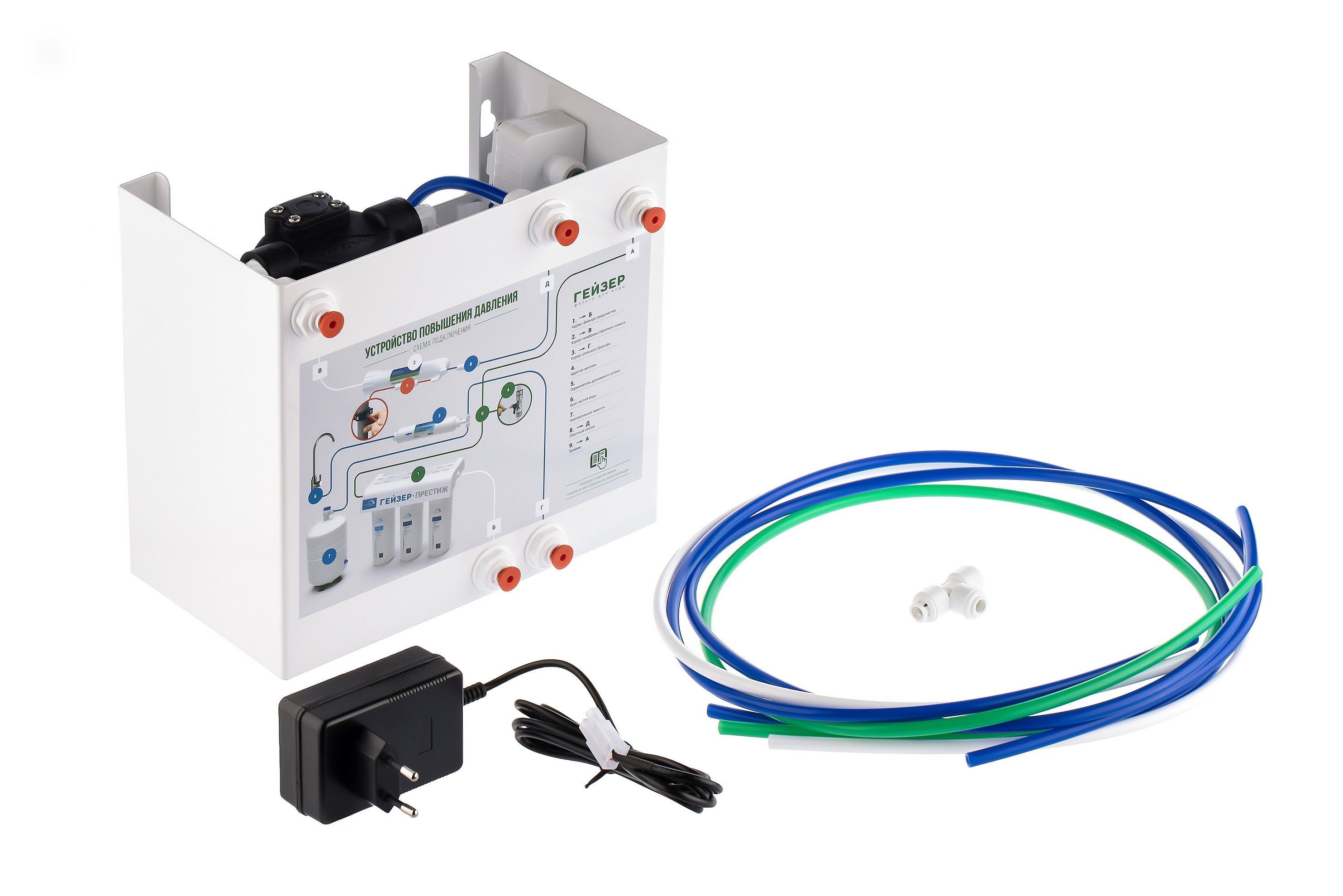 Устройство повышения давления Гейзер используется для дооснащения систем обратного осмоса при недостаточном давлении в магистрали подачи исходной воды. Компактный модуль включает помпу и все управляющие элементы.