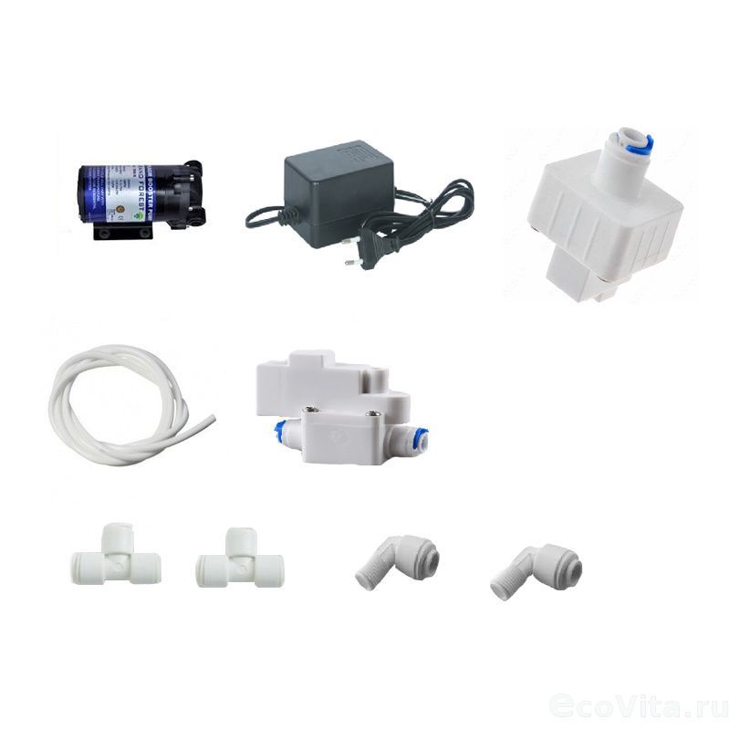 Диафрагменный бустерный насос, встроенный в систему обратного осмоса, повышает давление в системе.