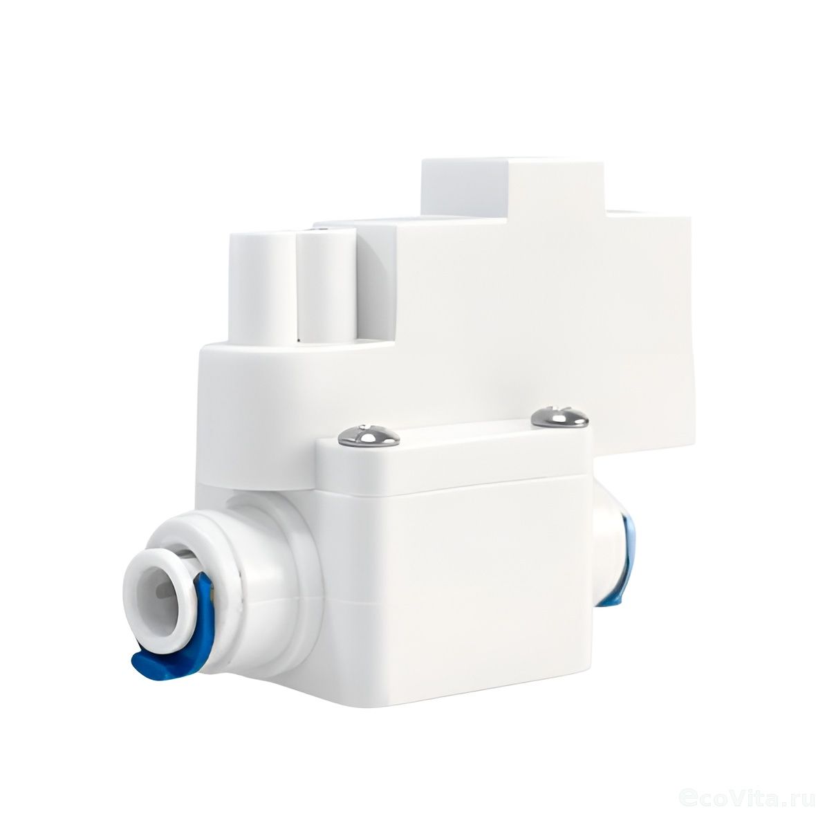 Реле представляет собой пластиковый корпус с двумя входами под трубку 1/4" для подключения системы фильтрации и разъема для соединения с повысительным насосом.