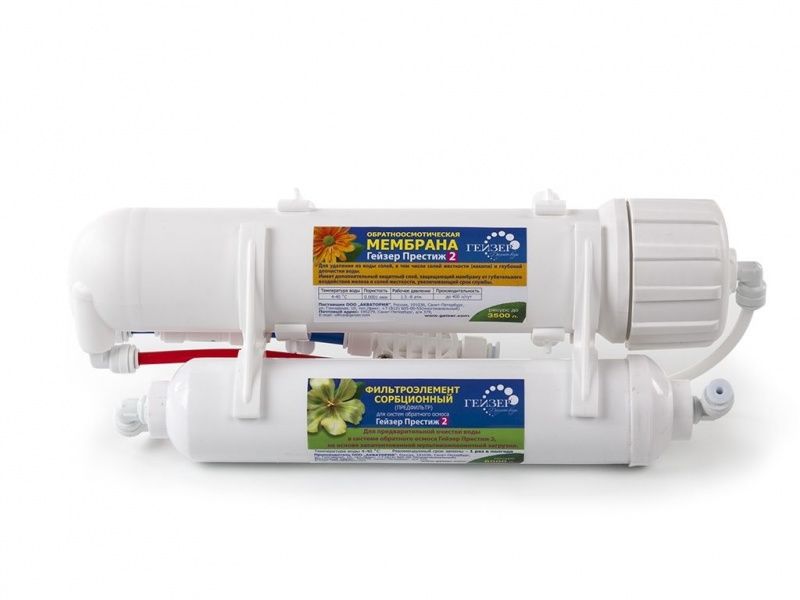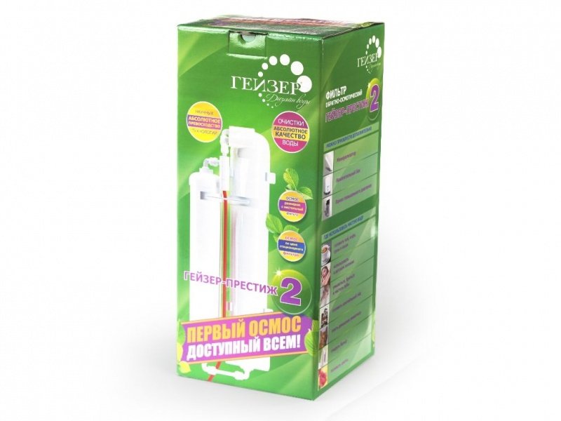 Фильтр Гейзер Престиж-2 с баком 8 л создан с использованием технологии обратного осмоса. Фильтрация воды осуществляется через полупроницаемую мембрану, поры которой пропускают только молекулы воды и кислорода. Так как размер молекул большинства примесей, а также бактерий и вирусов значительно больше молекул воды, мембрана успешно задерживает их.