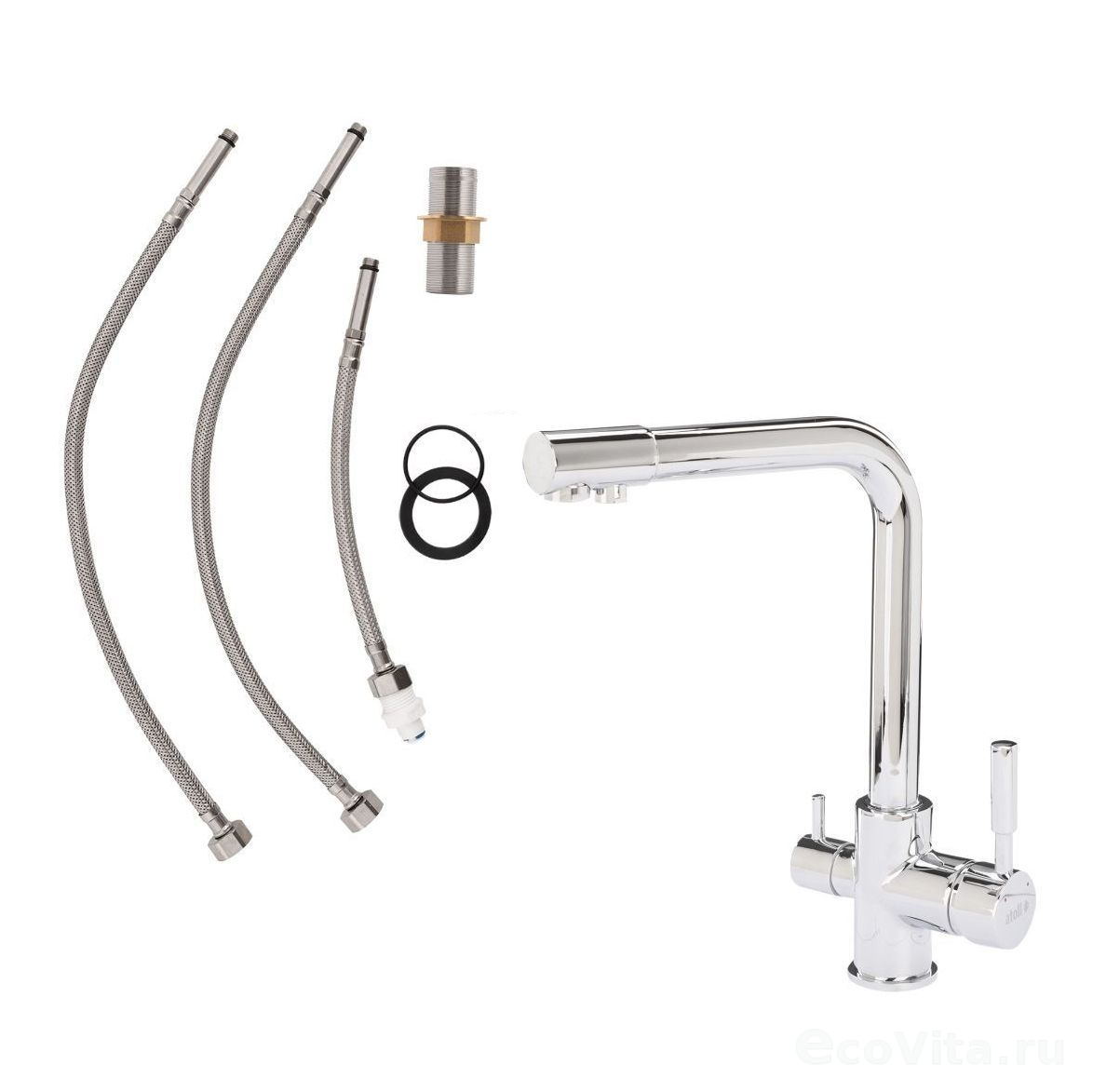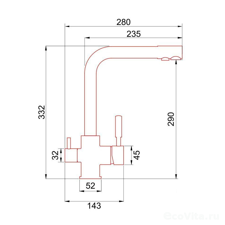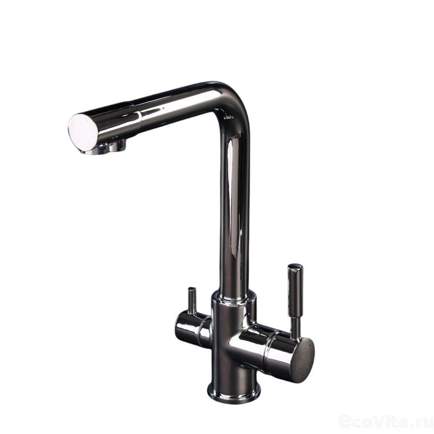 Практичная модель прямоугольной формы оснащена тремя функциями: подключение к фильтру, подача очищенной питьевой воды и обычная холодная/горячая вода из-под крана. Конструкция предусматривает раздельные каналы подачи, исключающие смешивание фильтрованной и водопроводной воды.