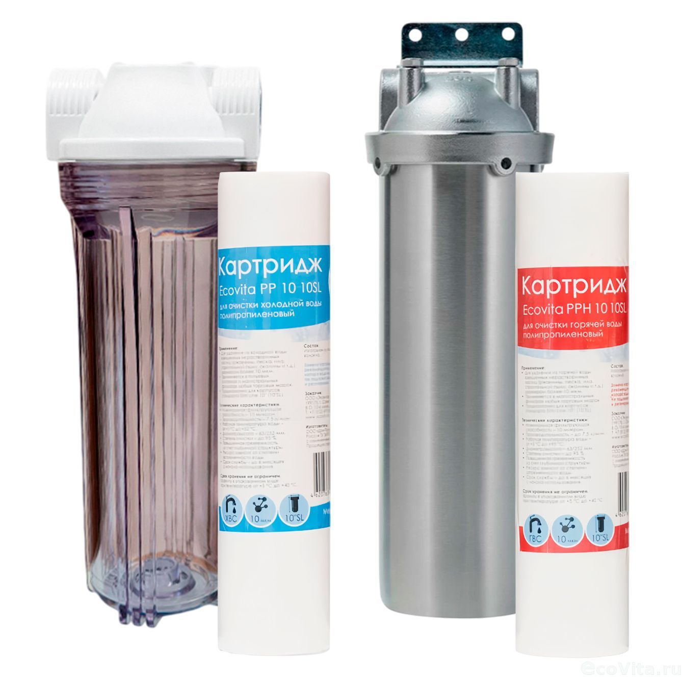 Комплект магистральных фильтров Ecovita 3/4" 10SL прозначный + Гидротек HMS 3/4" с картриджами 10 мкм для очистки холодной и горячей воды от механических примесей (ржавчина, окалина, песок и т.д.).