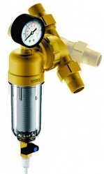 Фильтр грубой очистки обладает компактными размерами и подходит для монтажа в небольших по площади местах. В обычном рабочем режиме пропускает воду через сетчатый элемент фильтра к выпускному отверстию корпуса. Для промывки фильтра открывается шаровой клапан, который пропускает задержанные частицы.