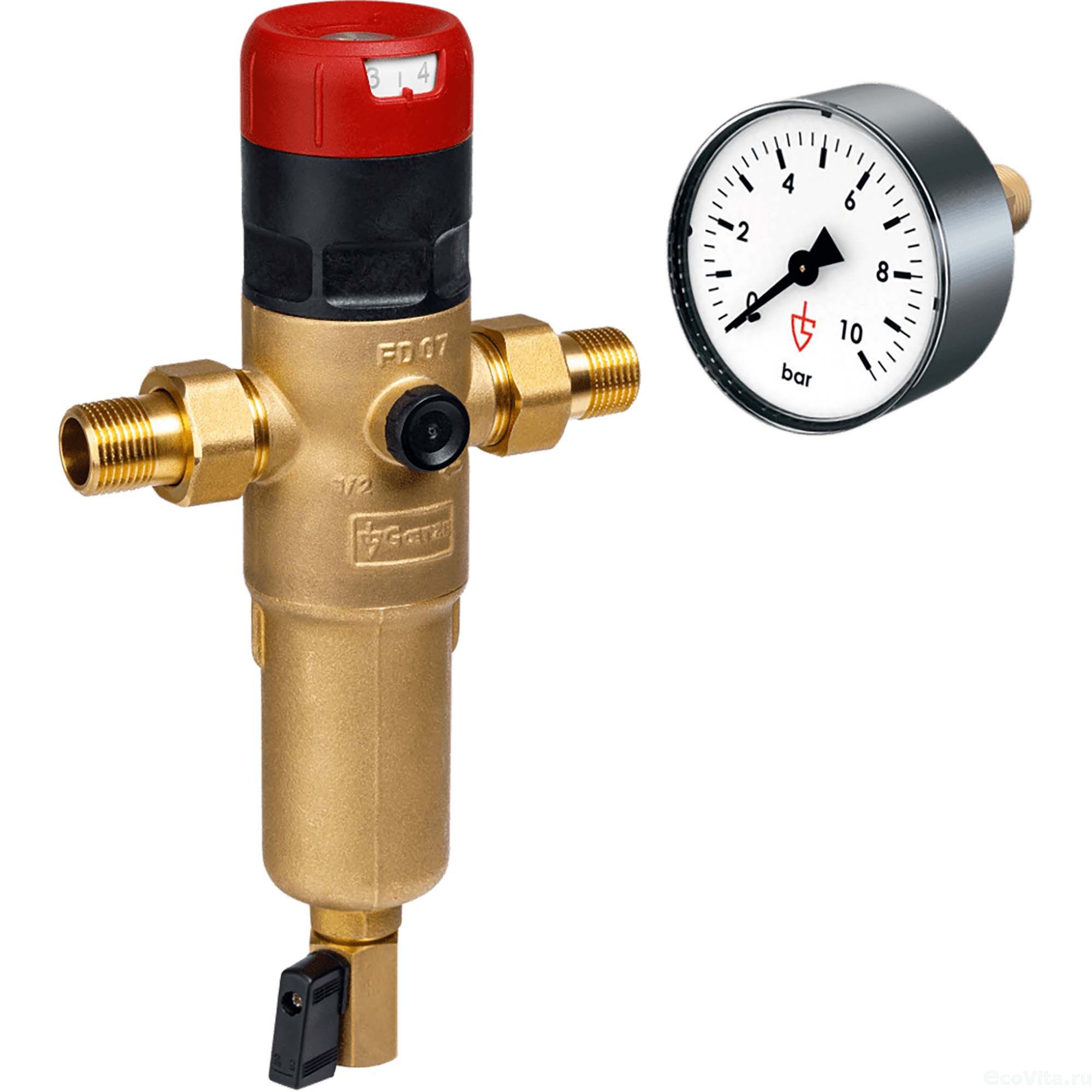 - для предотвращения разрушающего воздействия механических частиц на весь водопровода вместе с подключённой к нему техникой, включая собственный внутренний механизм редуктора давления. Сетчатый фильтр удаляет из воды нерастворимые механические частицы размером более 100 микрон, и позволяет промывать сетку не прерывая работу всего устройства