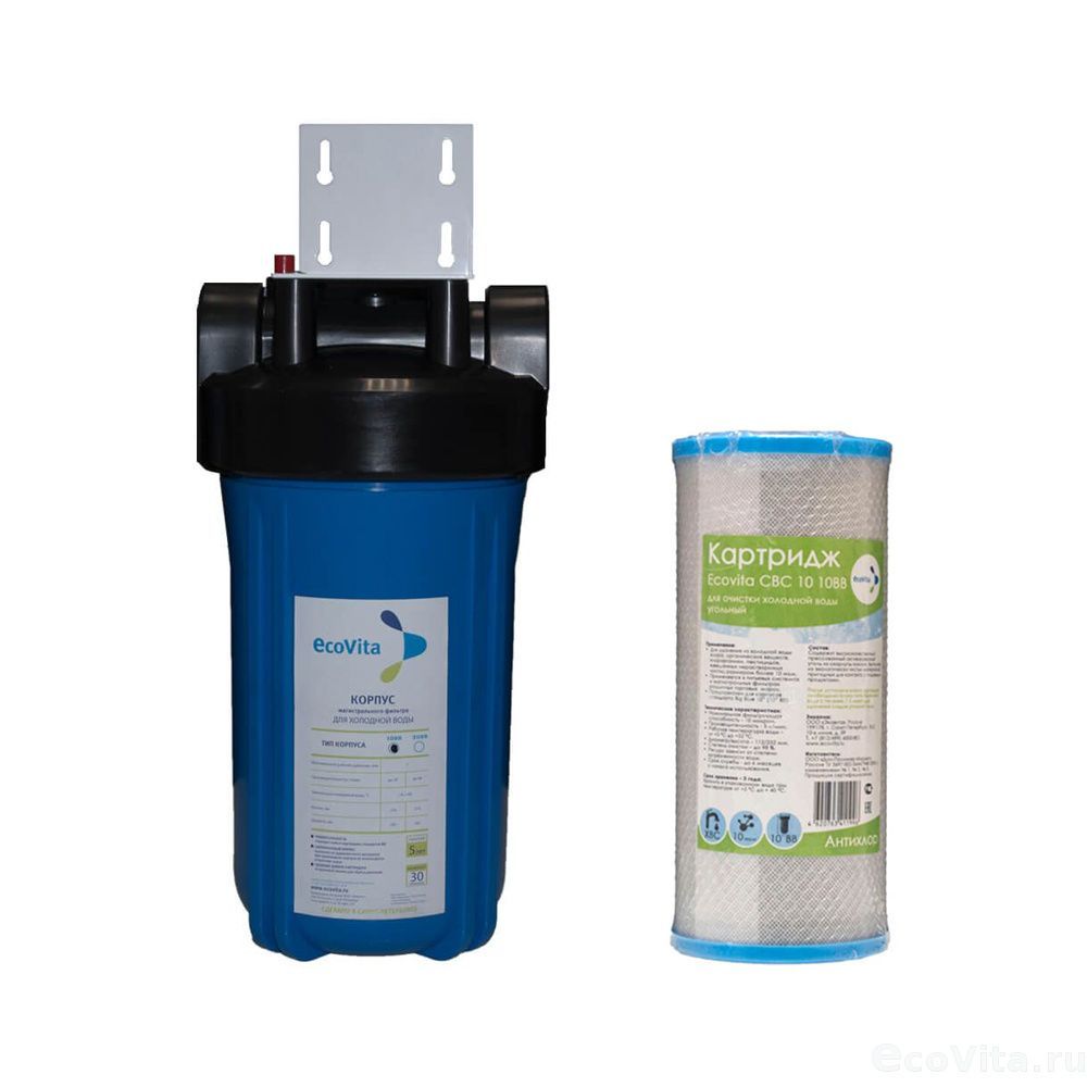Корпус фильтра Ecovita с угольным сменным модулем CBC 10 10BB устанавливается на "входе" холодной воды в квартире или загородном доме. Угольный картридж удаляет из водопроводной воды взвешенные нерастворимые частицы (ил, ржавчина, песок и т. д.) размером от 10 мкм. Очищает воду от хлора, органических соединений, хлорорганики, пестицидов и взвешенных нерастворимых частиц.