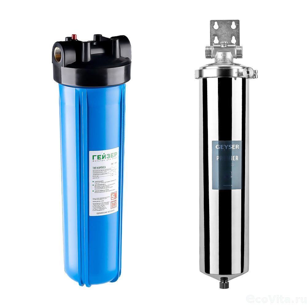Комплект магистральных фильтров Гейзер 20BB для очистки холодной и горячей воды в квартире или загородном доме.