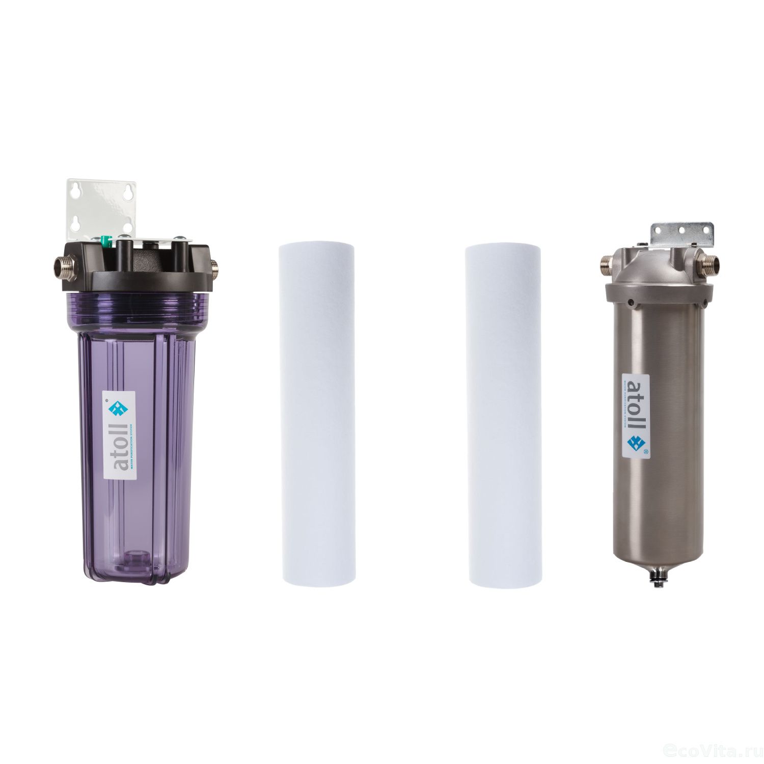 Комплект магистральных фильтров Atoll Оптимум 10SL 1/2" для очистки холодной и горячей воды от механических примесей (ржавчина, окалина, песок и т.д.).