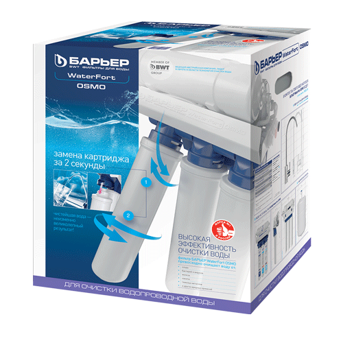 Фильтр Барьер WaterFort OSMO 5-ступенчатый, на основе обратного осмоса состоит из блока предфильтров, мембраны, накопительного бака и постфильтра. Обратный осмос обеспечивает очистку от всех примесей на 99,9%. Он удаляет из воды: хлор, хлорорганические соединения, нитраты, тяжелые и токсичные металлы, соли жесткости, нефтепродукты, бактерии и вирусы, механические загрязнения.