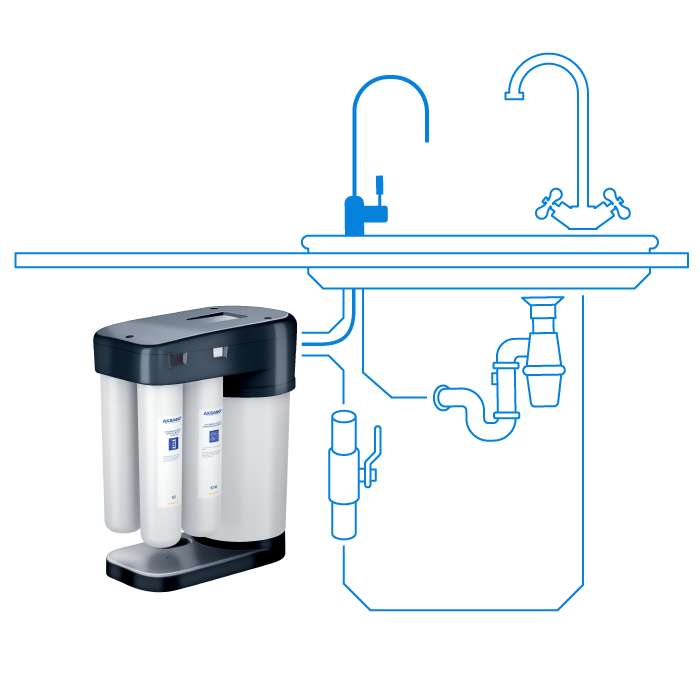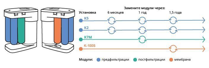 - Модуль K2: доочистка воды. Удаляет вредные примеси, в том числе взвеси, хлор, тяжелые металлы и органические вещества;