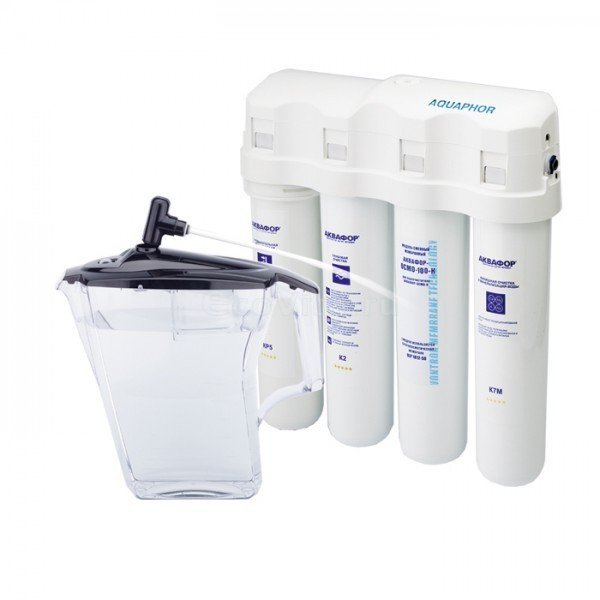 - Обратноосмотическая мембрана КО-100 — вода под давлением проходит сквозь мембрану и освобождается от всех вредных примесей, в том числе бактерий и вирусов, нитритов и нитратов, а также солей жесткости. Рекомендуемый срок замены 1,5 - 2 года;
