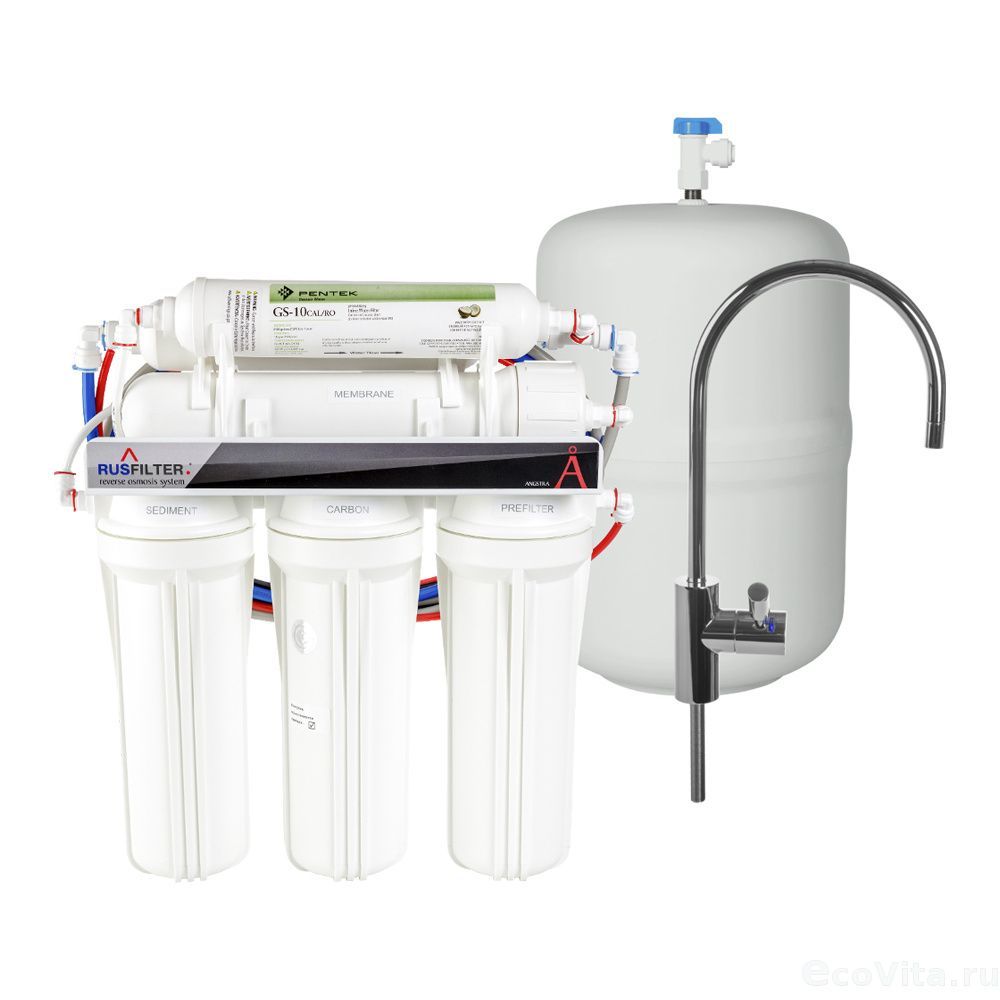 - Минерализатор Angstra GS-10CAL-RO – угольный постфильтр с кальцитом обогащает воду полезными минеральными солями. Повышает pH воды после обратноосмотической мембраны;