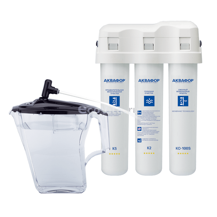 - Обратноосмотическая мембрана КО-100S - вода под давлением проходит сквозь мембрану и освобождается от всех вредных примесей, в том числе бактерий и вирусов, нитритов и нитратов, а также солей жесткости.