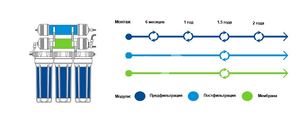 Предфильтры раз в 6 месяцев, постфильтр и мембрана - раз в 1.5 года.