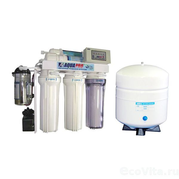 Бытовая пятиступенчатая установка обратного осмоса с насосом Aquapro AP-800 предназначена для очистки питьевой воды при подключении к системе коммунально-бытового водоснабжения. Система удаляет из воды до 99.9% всех примесей, благодаря этому Aquapro AP-800 можно использовать в квартире или загородном доме. Очищенная вода пригодна для питья, приготовления пищи, чая и кофе, полива цветов, аквариума, умывания и др.