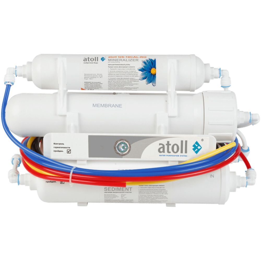 - Atoll GS-10CAL/RO угольный постфильтр с минерализатором – последняя ступень очистки, непосредственно перед питьевым краном. Угольный постфильтр с кальцитом эффективно используется только в случаях, когда фильтр долгое время не использовался и очищенная вода, находящаяся в баке и трубках, могла приобрести неприятный привкус или запах. Кальцит обогащает воду полезными минеральными солями;