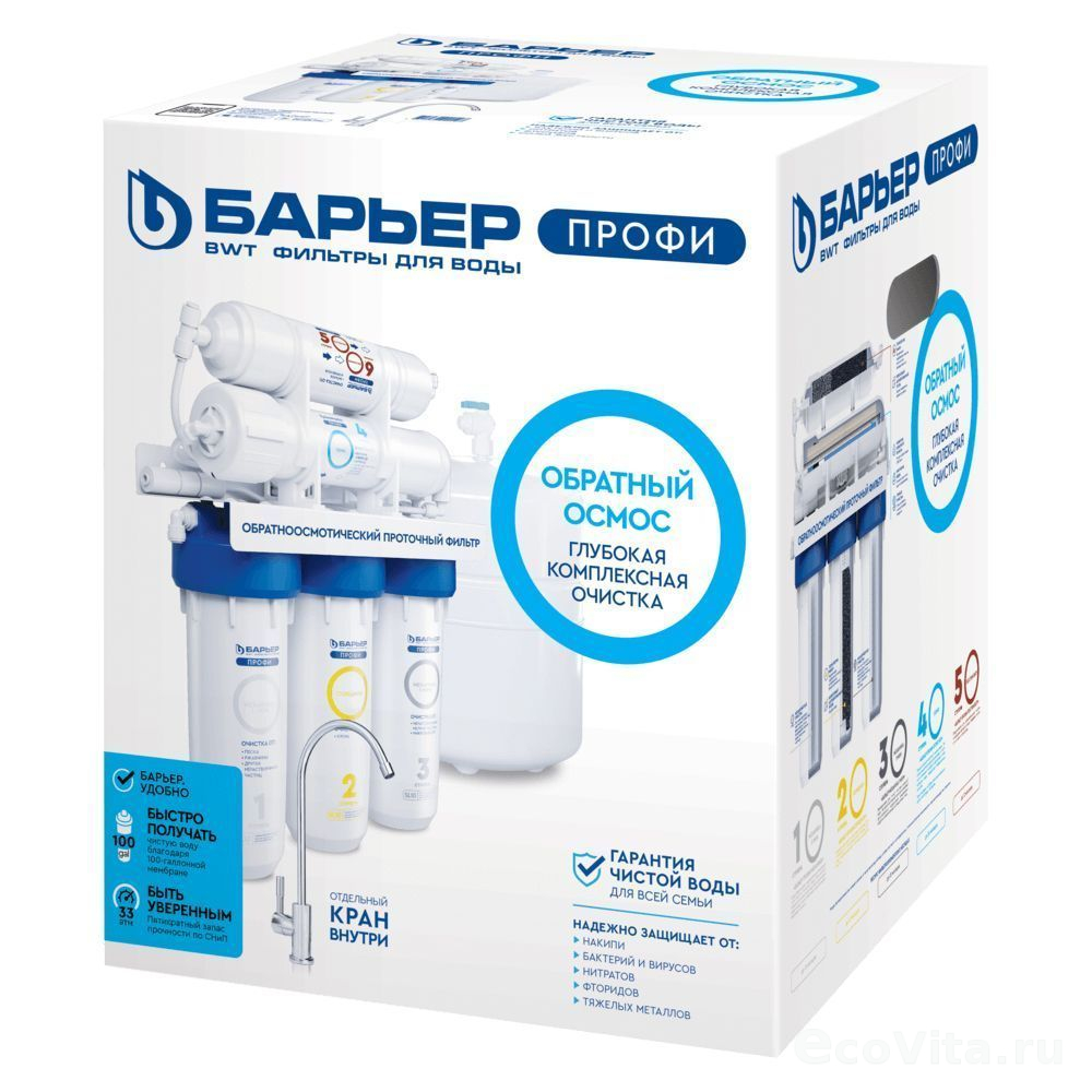 Фильтр Барьер Профи Осмо 100 на основе обратного осмоса состоит из блока предфильтров, мембраны, накопительного бака и постфильтра. Обратный осмос обеспечивает очистки от всех примесей на 99,5%. Он удаляет из воды: хлор, хлорорганические соединения, нитраты, тяжелые и токсичные металлы, соли жесткости, нефтепродукты, бактерии и вирусы, механические загрязнения.
