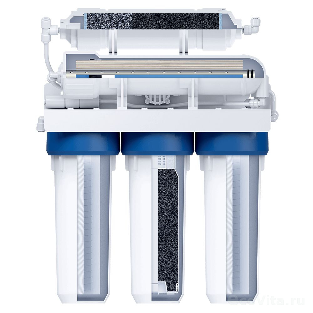- Обратноосмотическая мембрана - 3-х слойное полотно мембраны на основе тонкопленочного полиамидного композита с порами диаметром 0,0001 мкм. Диаметр пор настолько мал, что они пропускают только молекулы воды и газов. Производительность 100 галлон в сутки;