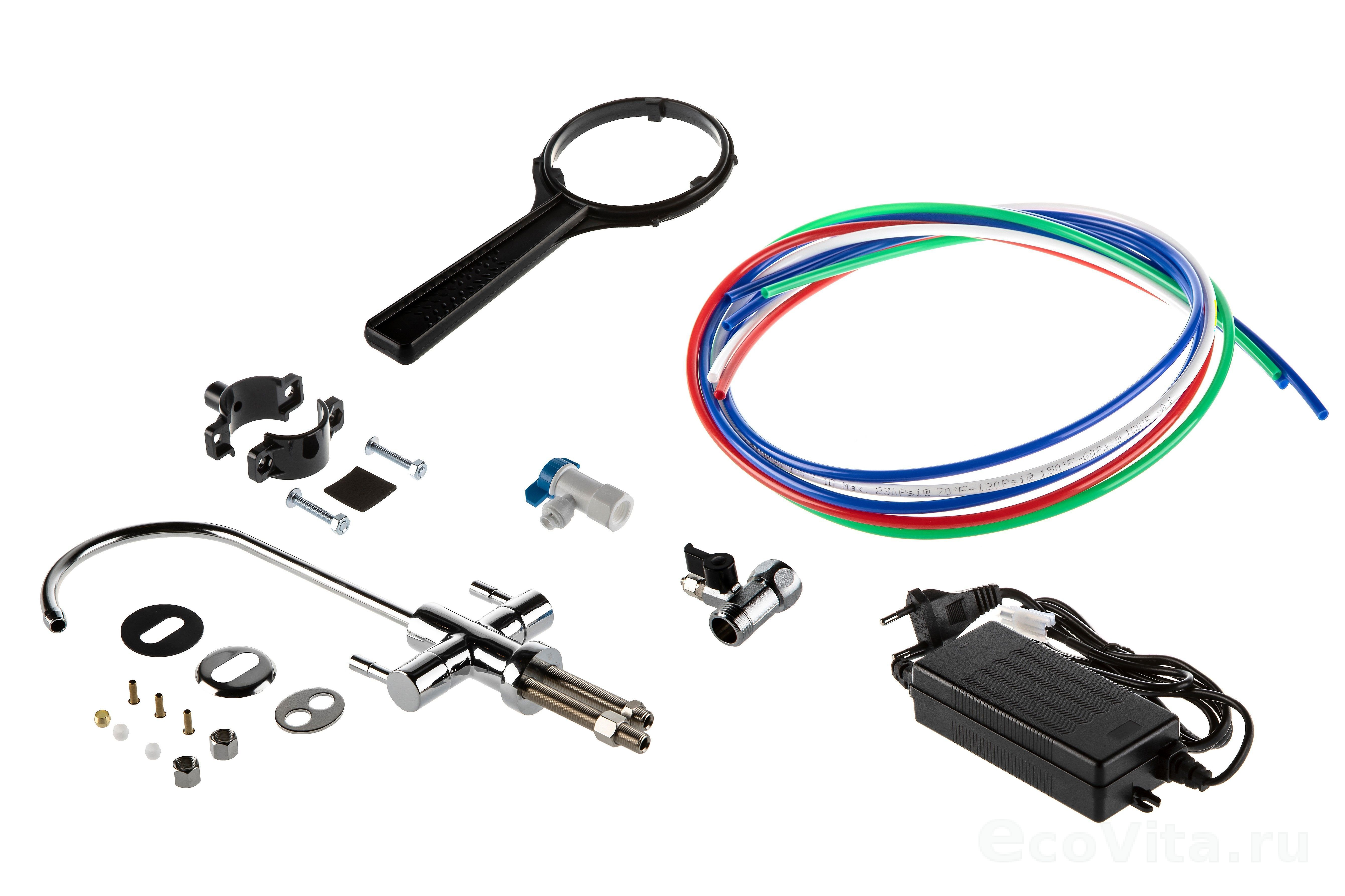 В комплект системы входит минерализатор «Баскон» для насыщения очищенной воды полезными солями кальция и магния до оптимального уровня жесткости воды — 1–1,5 мг–экв/л. Особый двухклавишный кран позволяет выбрать минерализованную или осмотическую воду (если вы хотите выпить стакан воды, обогащенной полезными микроэлементами) или без них (для приготовления чая, кофе). Вкус напитков, приготовленных на абсолютно чистой воде гораздо богаче и ароматнее.