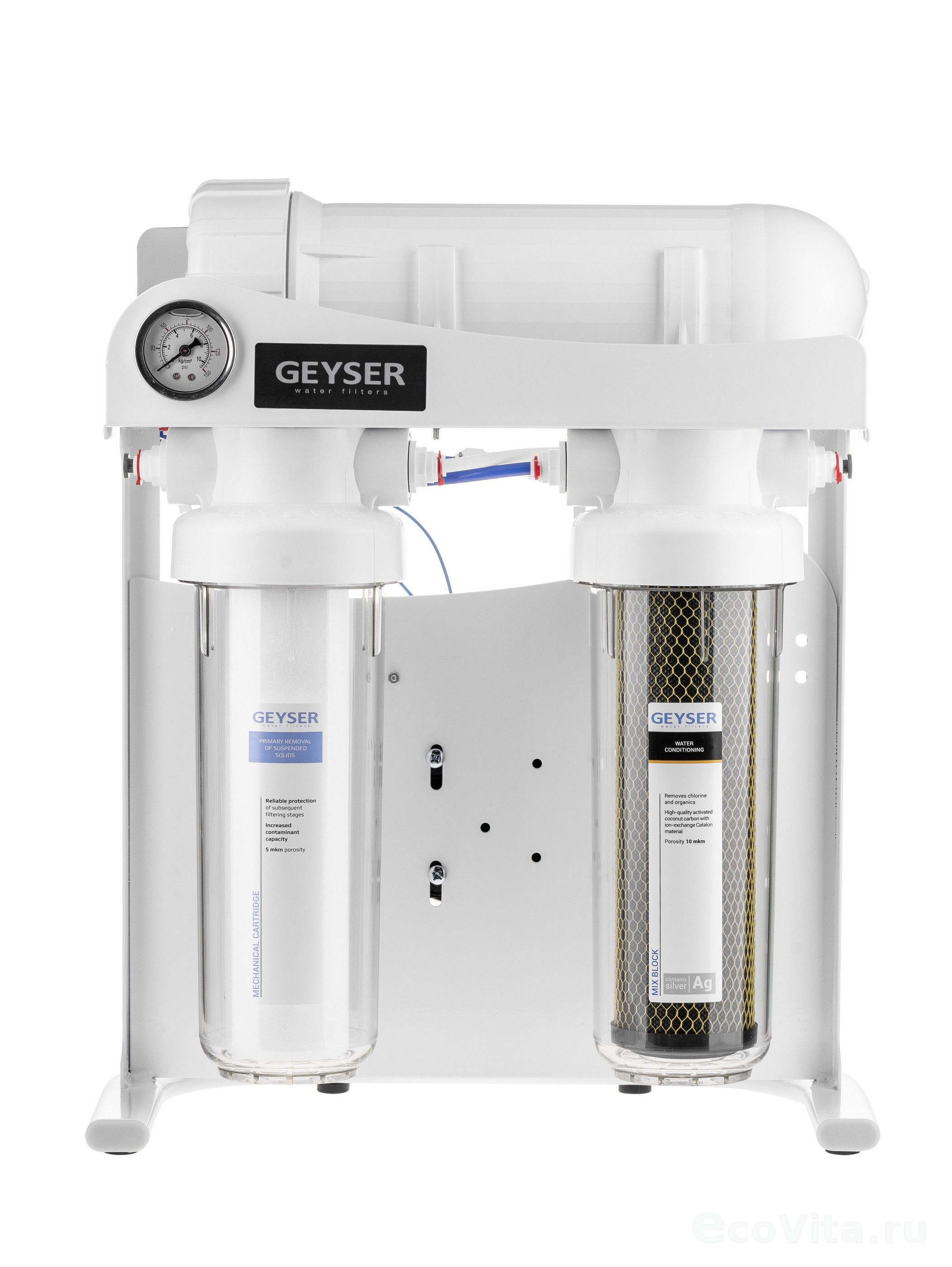 Система фильтрации на основе обратного осмоса Гейзер Престиж Плюс высокой производительности предназначена для доочистки водопроводной воды. Фильтр полностью удаляет из воды тяжелые металлы (свинец, кадмий, медь, железо, хром и др.), радиоактивные элементы (кобальт, полоний, цезий, радий), сульфаты, органические соединения, патогенные бактерии и вирусы. Все материалы, из которых изготовлен фильтр, безопасны и пригодны для контакта с питьевой водой.