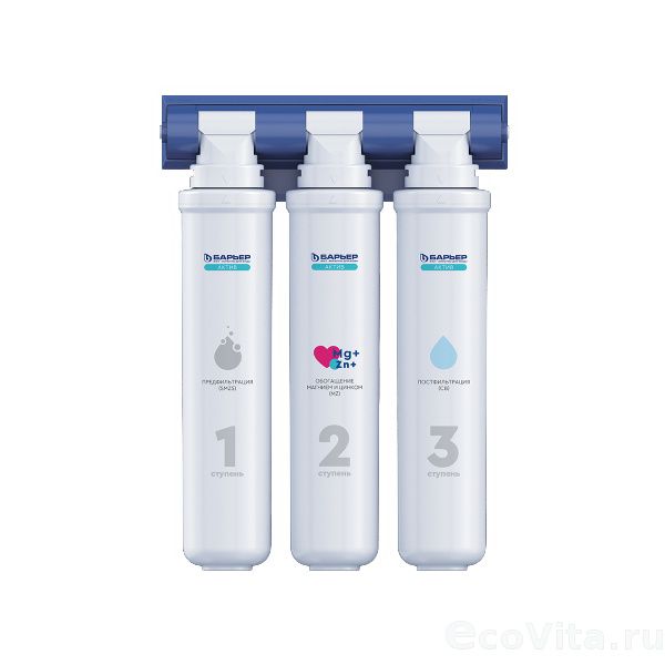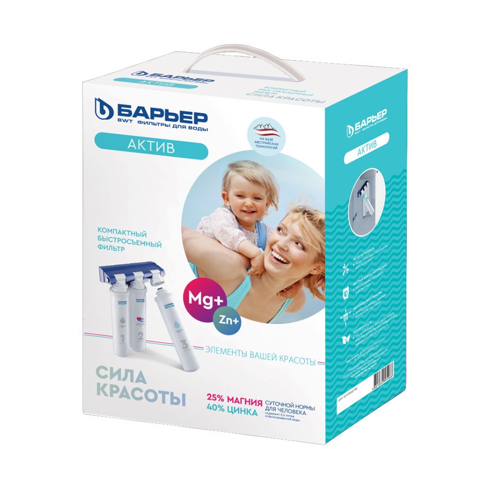 Фильтр Барьер АКТИВ Сила Красоты разработан на базе уникальных австрийских технологий обогащения воды полезными минералами. Трехступенчатый фильтр предназначен для доочистки питьевой водопроводной воды от механических примесей, активного хлора, органических загрязнений, тяжелых металлов, а также для обогащения воды полезными элементами. Многоступенчатая система обеспечивает высокую эффективность очистки на протяжении всего ресурса сменных элементов.