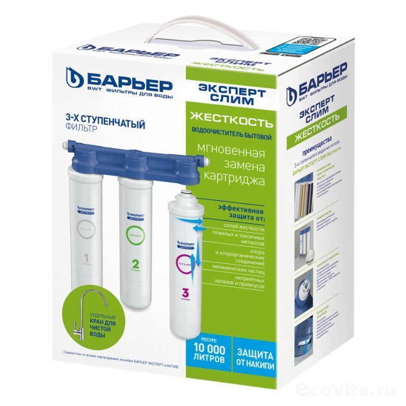 Фильтр Барьер ЭКСПЕРТ Слим Жесткость это изменённая версия популярной модели Барьер EXPERT, обеспечивает комплексную очистку от солей жесткости и всех основных содержащихся в ней вредных примесей. Предотвращает образование накипи за счет удаления из состава воды солей жесткости. Картриджи всё так же можно менять одной рукой, теперь положение фильтрующих элементов статично.
