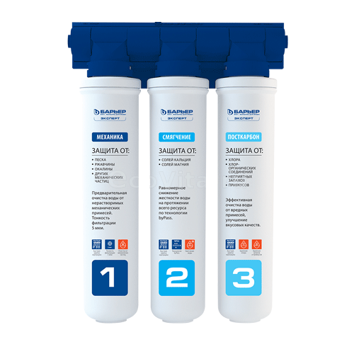- Барьер ЭКСПЕРТ Смягчение — картридж с ионообменной смолой. Снижает в воде содержание солей жесткости. Применение технологии «byPass» позволяет увеличить ресурс фильтроэлемента и избежать побочного эффекта гиперумягчения питьевой воды в начале ресурса;