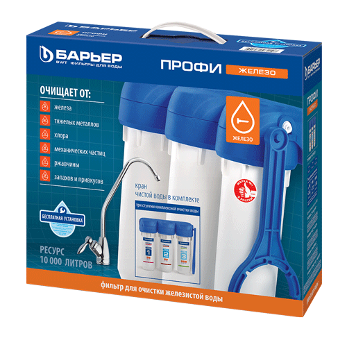 Фильтр Барьер ПРОФИ Железо представляет собой три ступени очистки водопроводной воды. Защищает от крупных механических частиц, активного хлора, ионов тяжелых и токсических металлов. Эффективно очищает от железа, устраняет неприятные запахи и привкус воды.