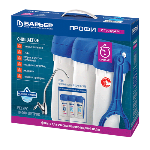 Фильтр Барьер ПРОФИ Стандарт - базовая очистка водопроводной воды. Три ступени обеспечивают эффективную очистку водопроводной воды от активного хлора, органических и хлорорганических соединений, тяжелых металлов и других вредных веществ.