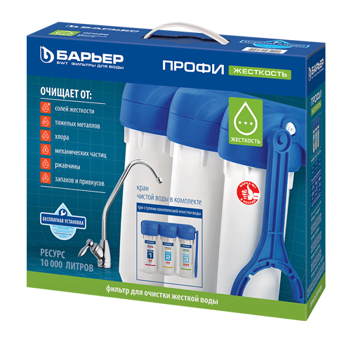 Фильтр Барьер ПРОФИ Жесткость - базовая очистка водопроводной воды. Три ступени обеспечивают эффективную очистку водопроводной воды от активного хлора, органических и хлорорганических соединений, тяжелых металлов и других вредных веществ. Снижает содержание солей жесткости в воде без эффекта гипер-умягчения.