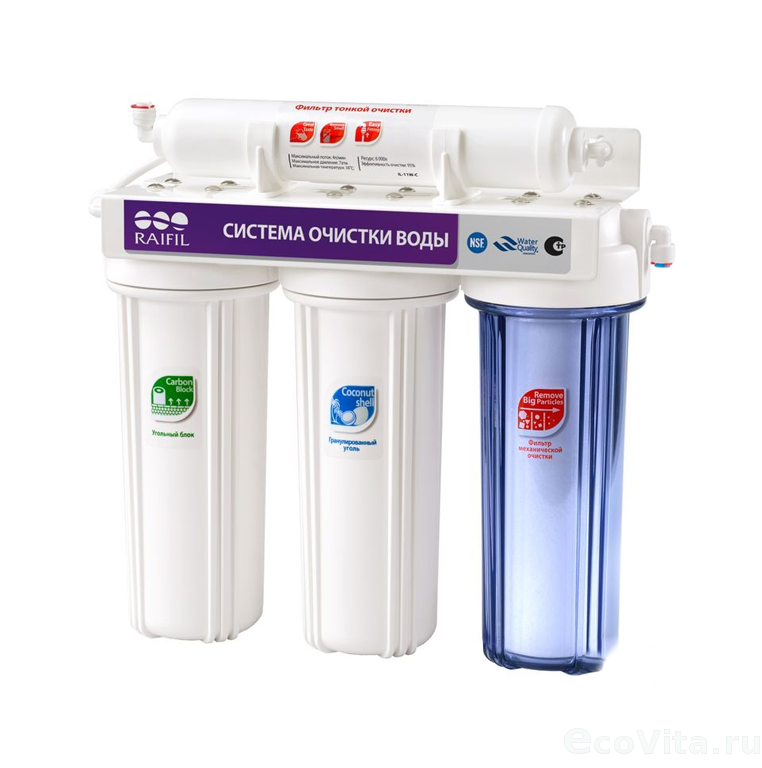 - Угольный фильтр тонкой очистки - постфильтр очищает воду от широкого спектра органических и неорганических растворенных примесей, свободного хлора, хлорорганических соединений, пестицидов, нефтепродуктов, тяжелых металлов, устраняет неприятный запах воды, улучшает ее вкусовые качества.