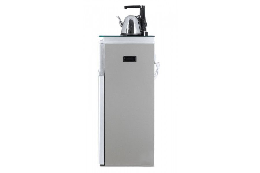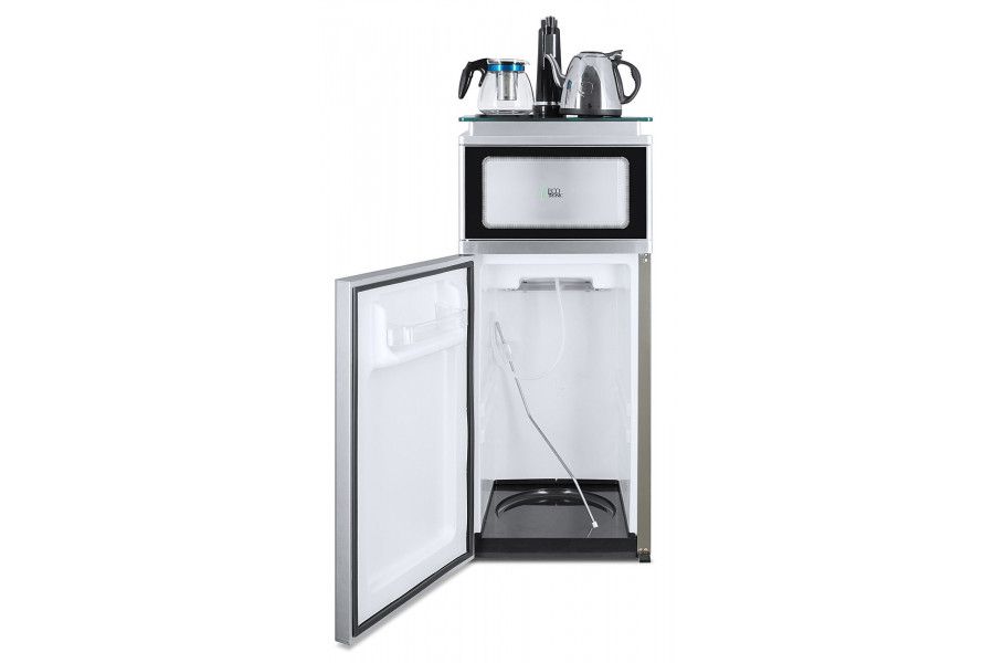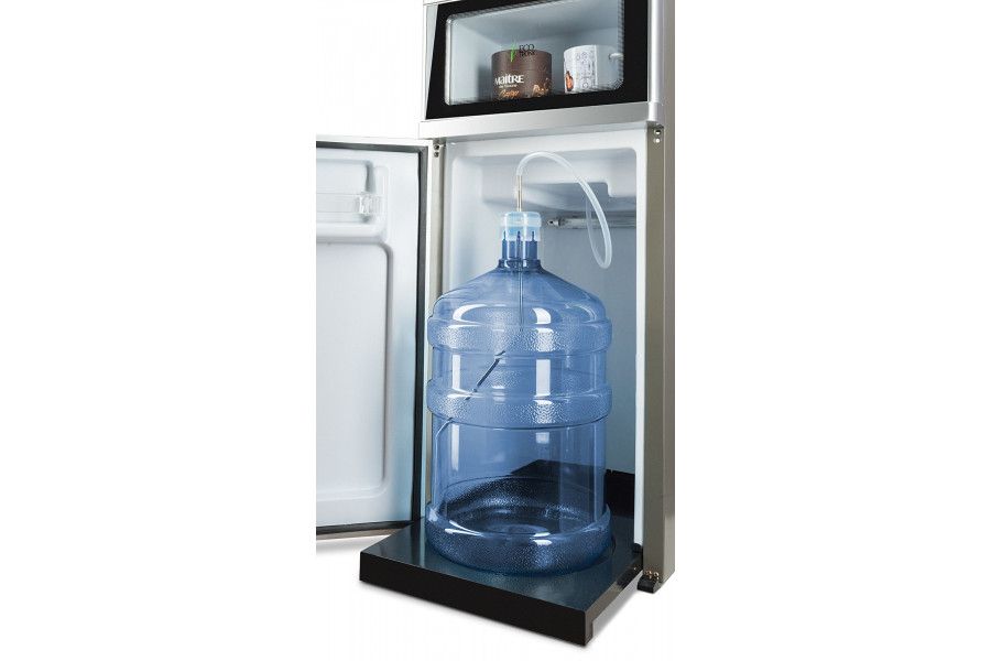- Также в конструкции предусмотрен шкафчик для хранения продуктов. Бутыль устанавливается на выкатную полку. Тип охлаждения – электронный. О работе аппарата оповещает информационный дисплей сверху. Панель управления сенсорная, на русском языке.
