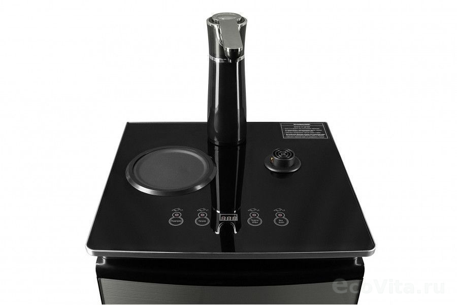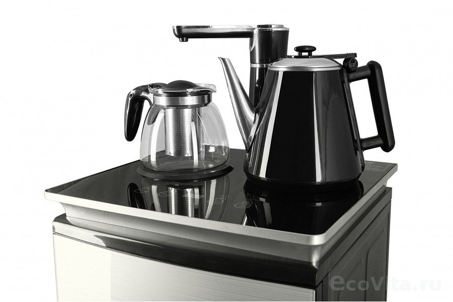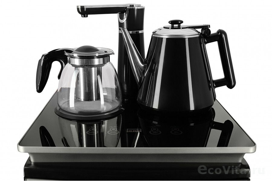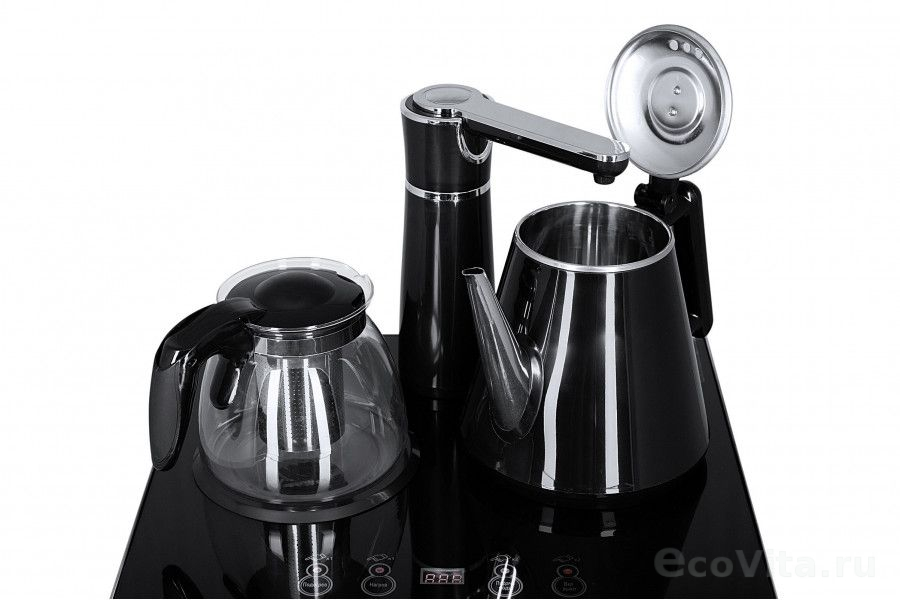 - На чайном столике расположен кран подачи воды и два чайника, для кипячения и заварочный. Заварочному чайнику можно включить режим постоянного подогрева (~ до 60°С). Чайник кипячения изотермический – меньше греется, лучше сохраняет температуру. Подача воды в него возможна без открытия крышки. Нагрев воды в чайнике включается вручную, либо автоматически в случае использования функции регулировки температуры воды Автоотключение нагрева при температуре 100°С.
