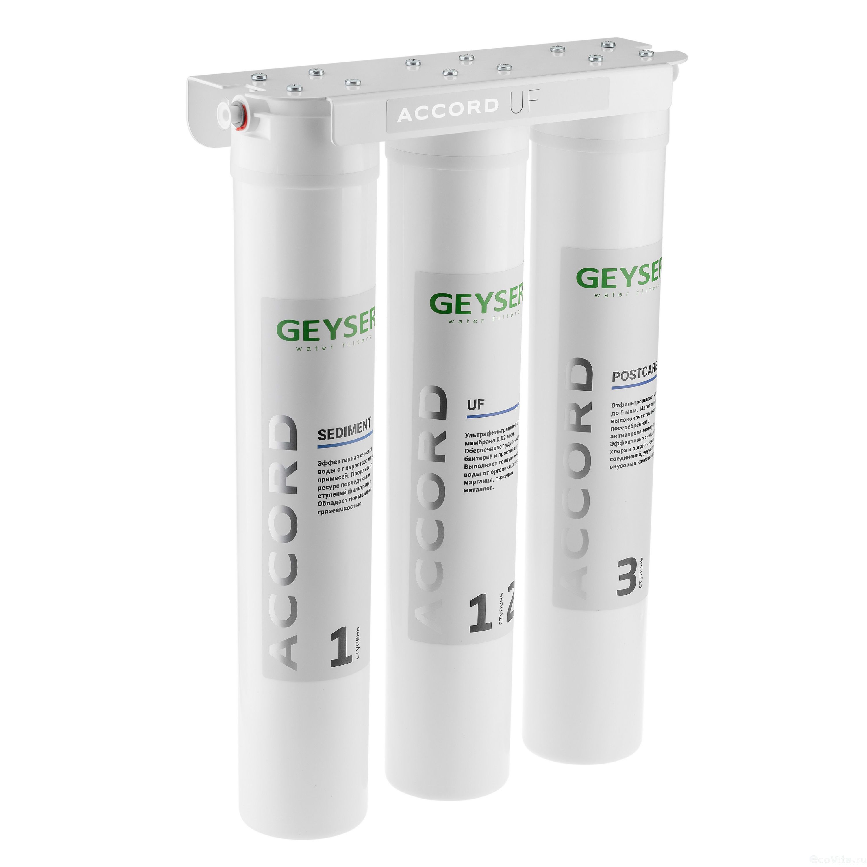 - UF Accord – мембрана, позволяет очищать воду на механическом уровне с порогомс0,02 мкм, что предотвращает возможность прохождения через фильтр вирусовси бактерий. Очистка воды через UF мембрану обеспечивает удаление до 97 % железа, до 99,9 % бактерий, вирусов и до 100 % взвешенных веществ.