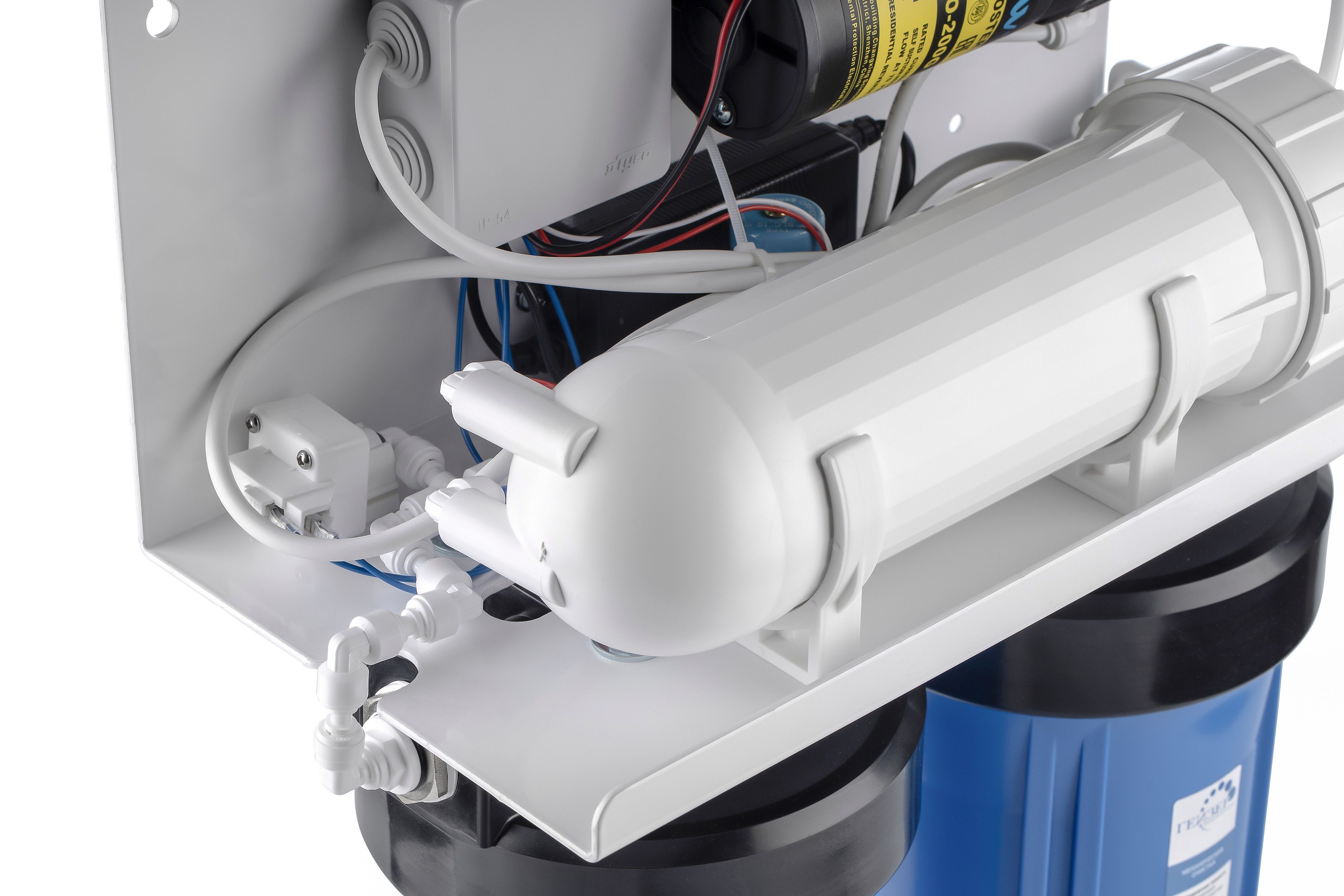 - Основная очистка воды выполняется на одной обратноосмотической мембране стандарта 3012. Пористость мембраны 0.0001 мкм. Рекомендуемый срок замены - 2 года.