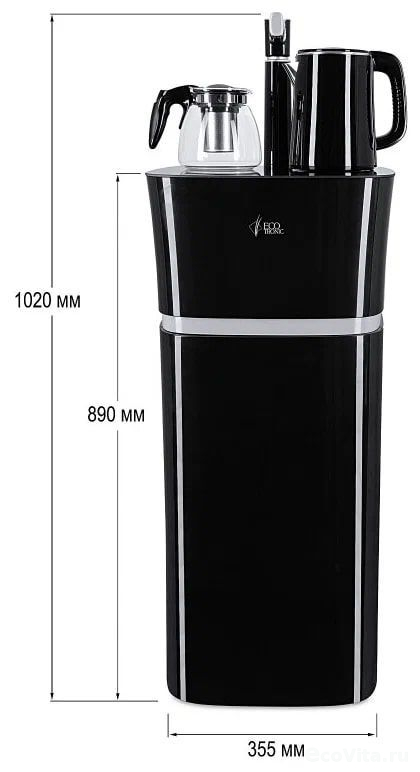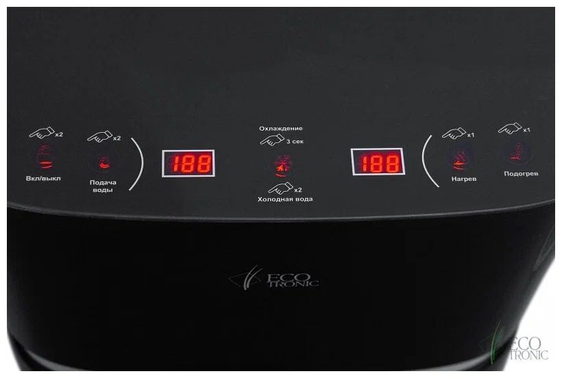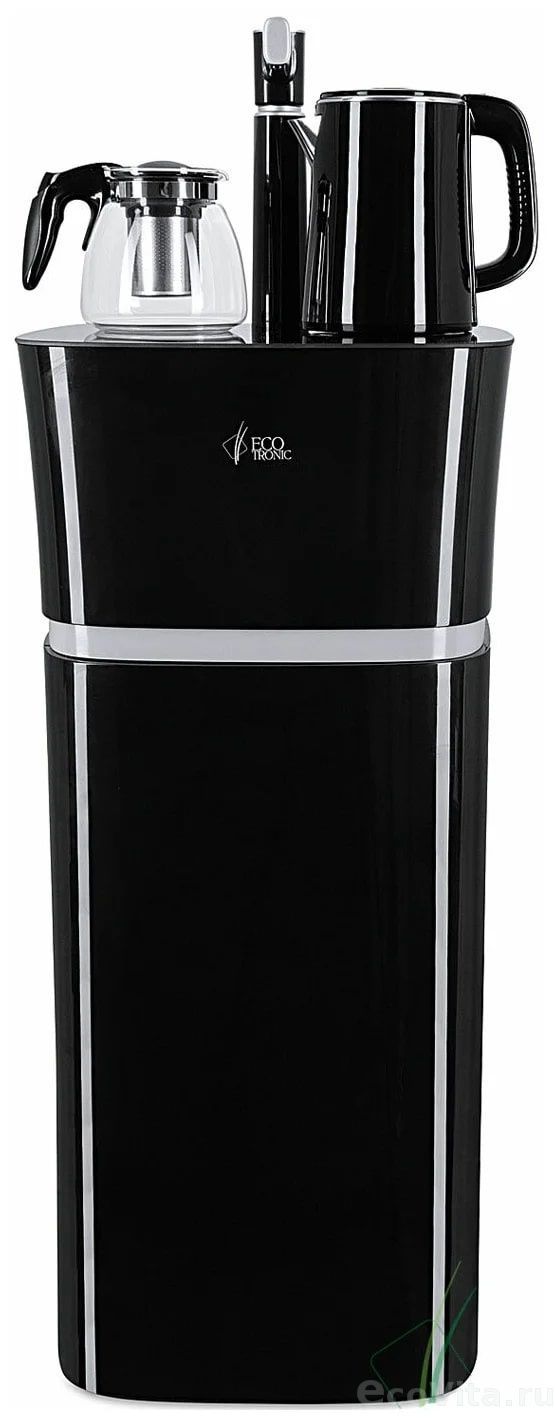 Тиабар Ecotronic TB11-LE black – это напольный кулер с чайным столиком. Нижняя загрузка бутыли, электронное охлаждение. Нагрев воды в чайнике до 100°С. Два чайника – для кипячения (изотермический) и заварочный.