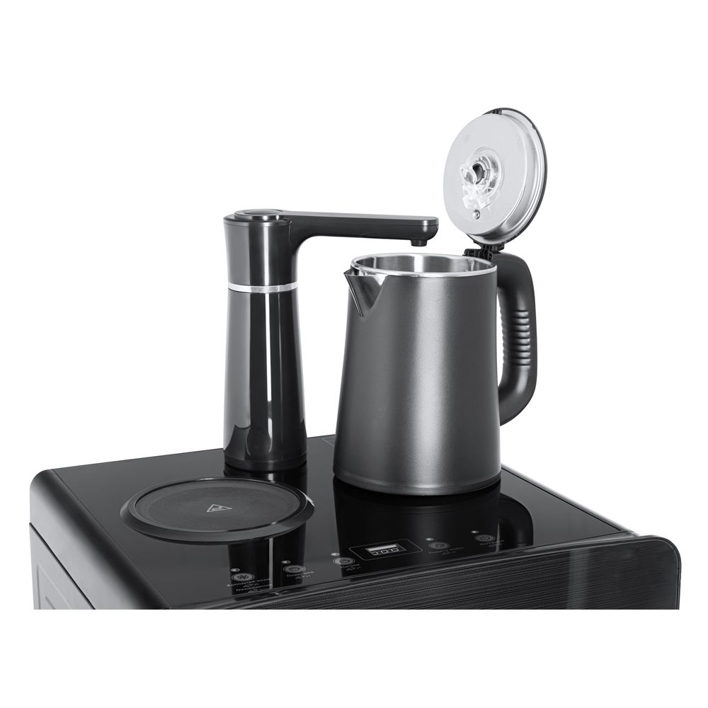 Два места под чайники - для кипячения и заварочный. Электронное охлаждение, нагрев до 100°С. Датчик отсутствия воды, при отсутствии воды в чайнике нагрев автоматически отключается. Датчик уровня воды, защита электрического чайника от перелива. Шкафчик для хранения.