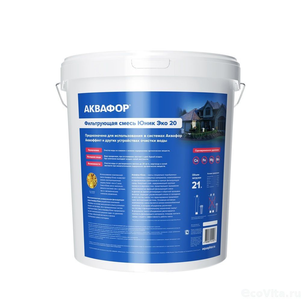 Фильтрующий материал Аквафор Юник Эко 20 - многоцелевая загрузка для комплексного решения задач по удалению из воды избыточной жесткости и железа в загородных домах и коттеджах. Представляет собой смесь ионообменных и инертных материалов.