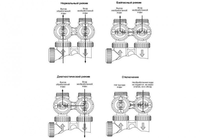 - В зависимости от режима работы клапана фильтр находится либо в режиме водоподготовки, либо в режиме фильтрации, либо диагностируется специалистом;