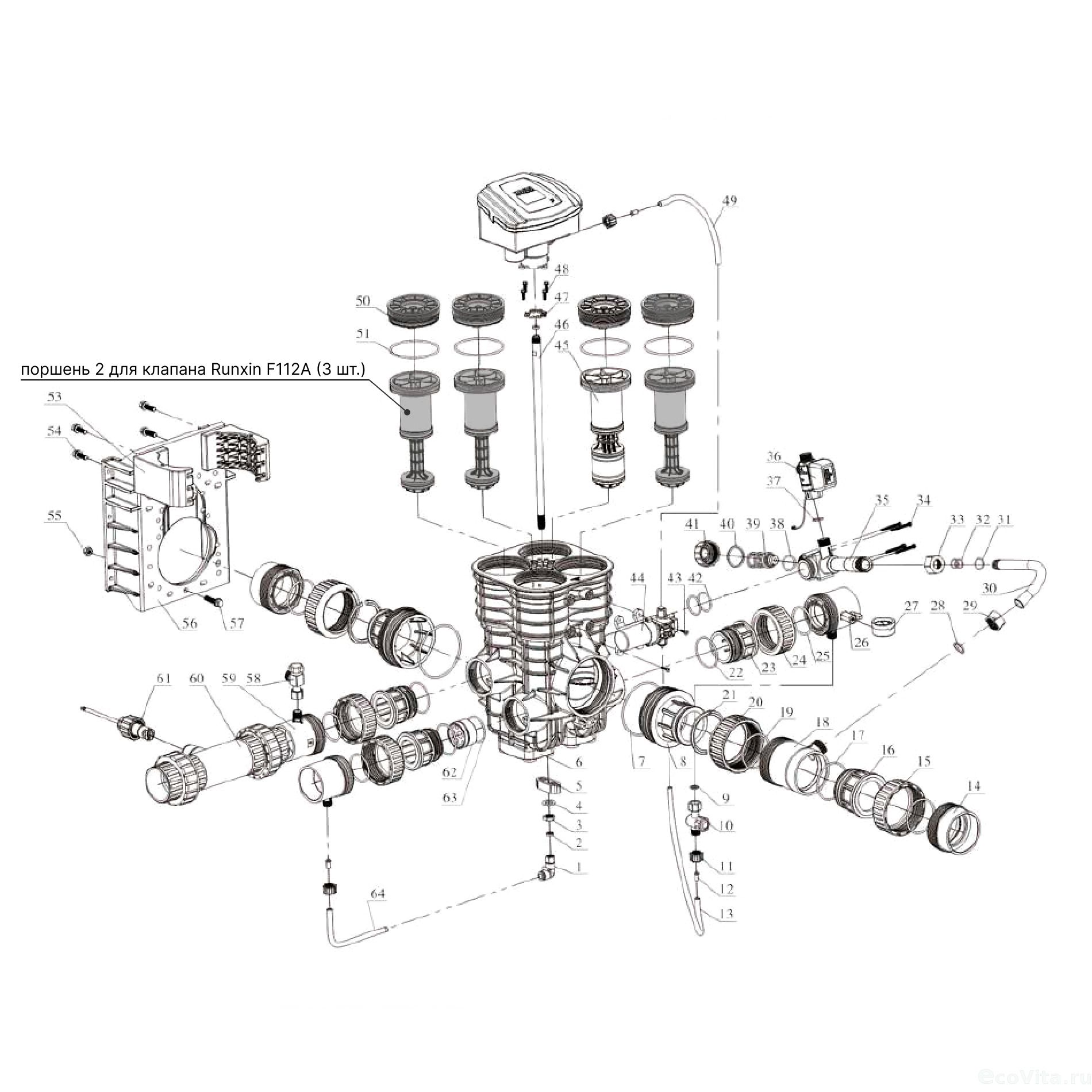 Поршень 2 для управляющего клапана Runxin F112A* играет важную роль в функционировании фильтра, осуществляя переключение между различными этапами регенерации: обратная промывка, солевой цикл, прямая отмывка.