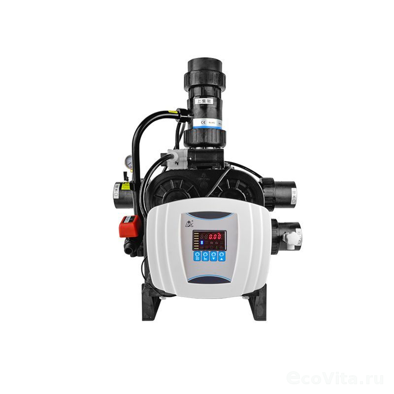 Он оснащен подсоединениями DN65. Он также крепится к баллонам фильтров размерами от 24 до 63 дюймов посредством порта DN80. Блок управления имеет боковую посадку, что очень удобно при работе с такими большими корпусами фильтров.