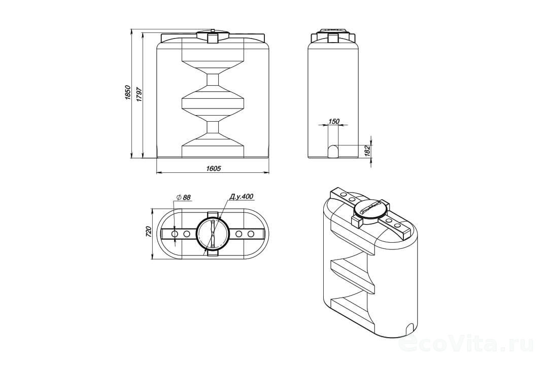 Вертикальная прямоугольная емкость 1500 л предназначена для хранения воды и жидкостей в системах водоподготовки.