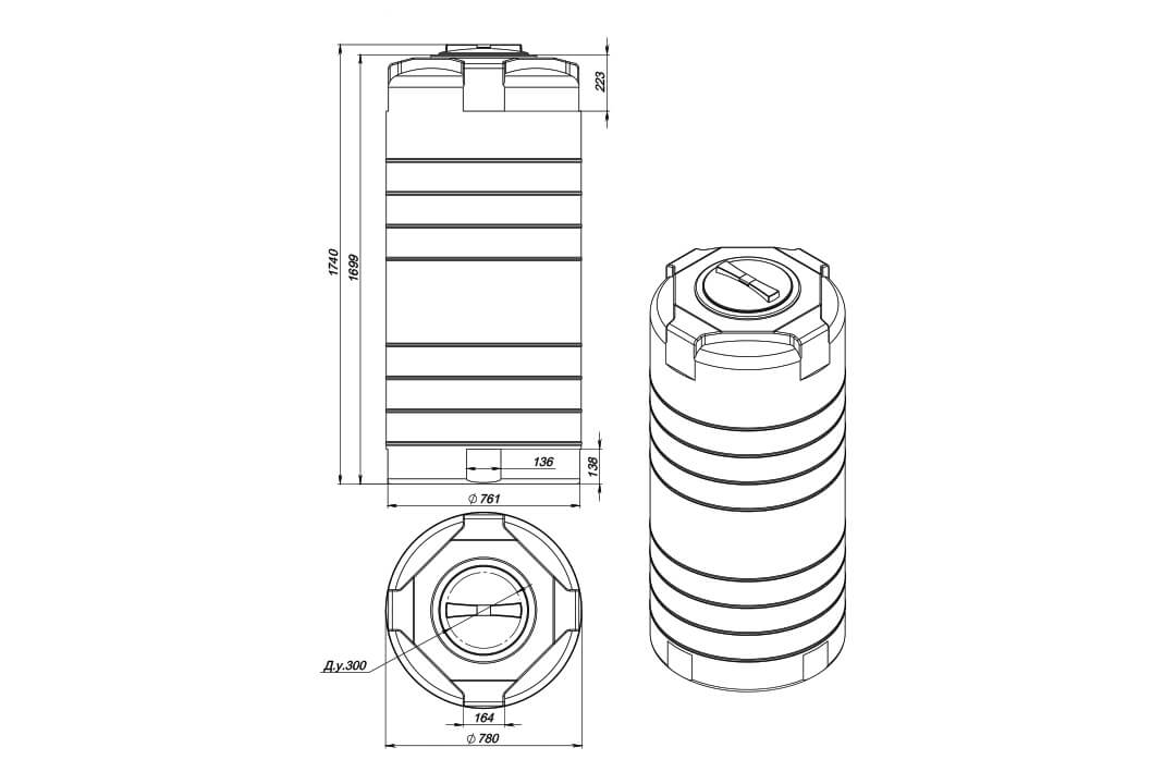 Вертикальная цилиндрическая емкость 750 л предназначена для хранения воды и жидкостей в системах водоподготовки.