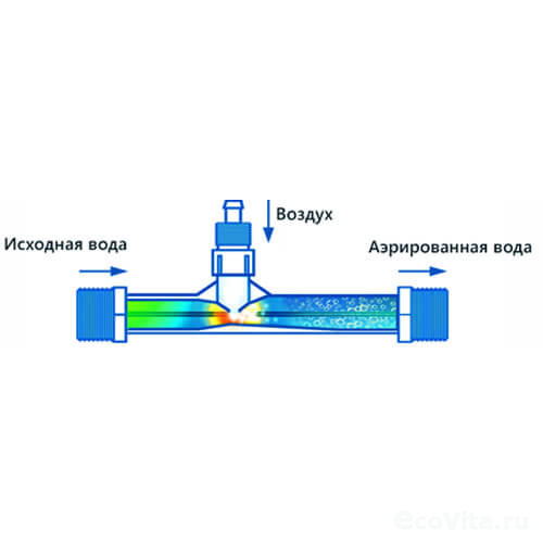 Эжектро использует кинетическую энергию потока воды. На входе вода попадает в трубку Вентури меньшего сечения, набирая скорость. Давление в полости наоборот падает. Внутри эжектора образуется вакуум, благодаря чему происходит всасывание воздуха через боковой патрубок и насыщение воды кислородом.