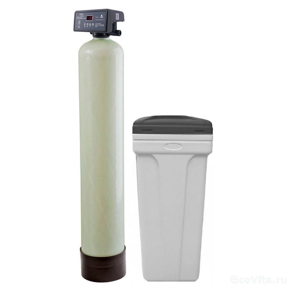 Умягчитель Ecovita EVS 12 RM с управлением по расходу воды. В зависимости от вида загрузки способен удалять соли жесткости, железо, марганец, органические вещества, тяжелые металлы и нитраты. Подходит для летней дачи и небольшого загородного дома.