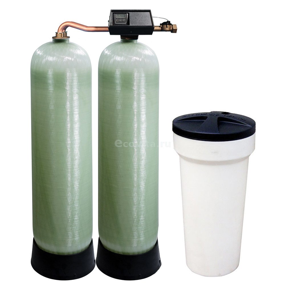 Умягчитель Ecovita EVS 18 FM Twin непрерывного действия на базе двух корпусов, установленных параллельно и объединенных блоком управления со счетчиком и промывкой по времени и по расходу.