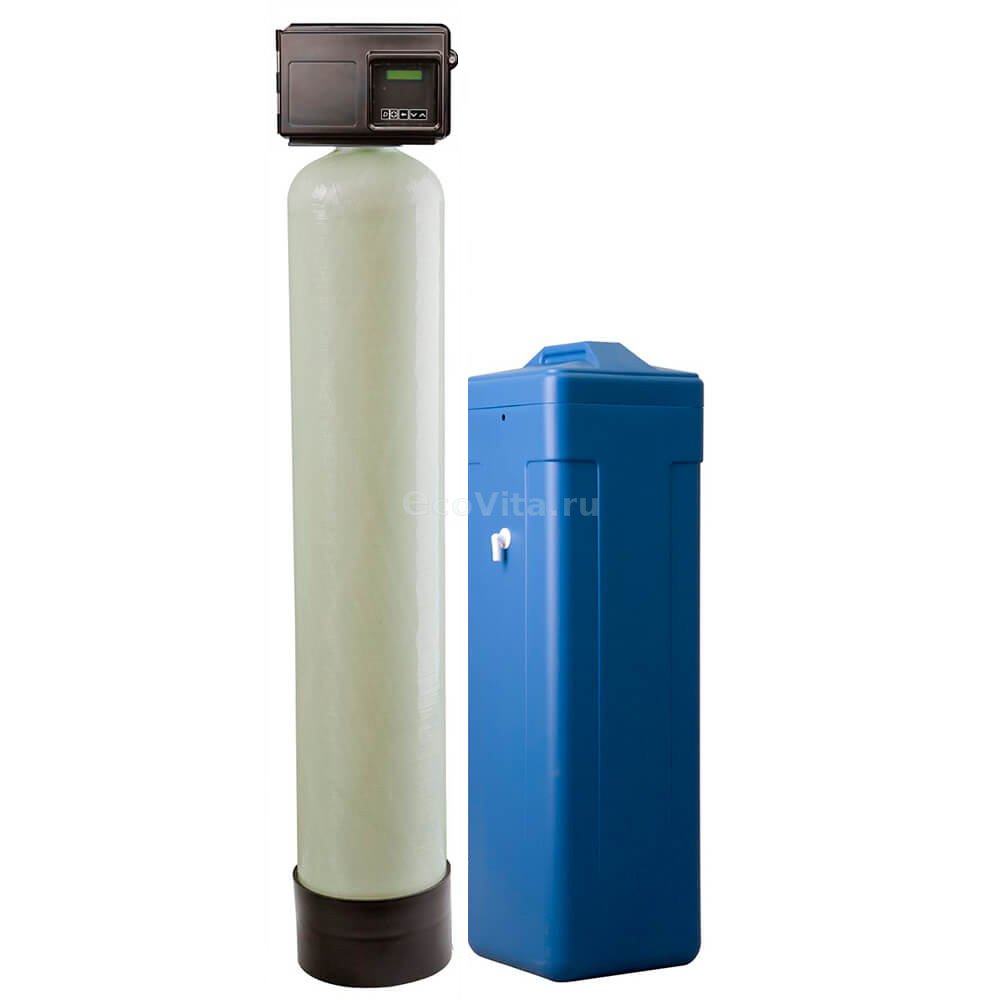 Умягчитель Ecovita EVS 24 FM с управлением по расходу воды. В зависимости от вида загрузки способен удалять соли жесткости, железо, марганец, органические вещества, тяжелые металлы и нитраты. Подходит для небольшого коттеджа или загородного дома.
